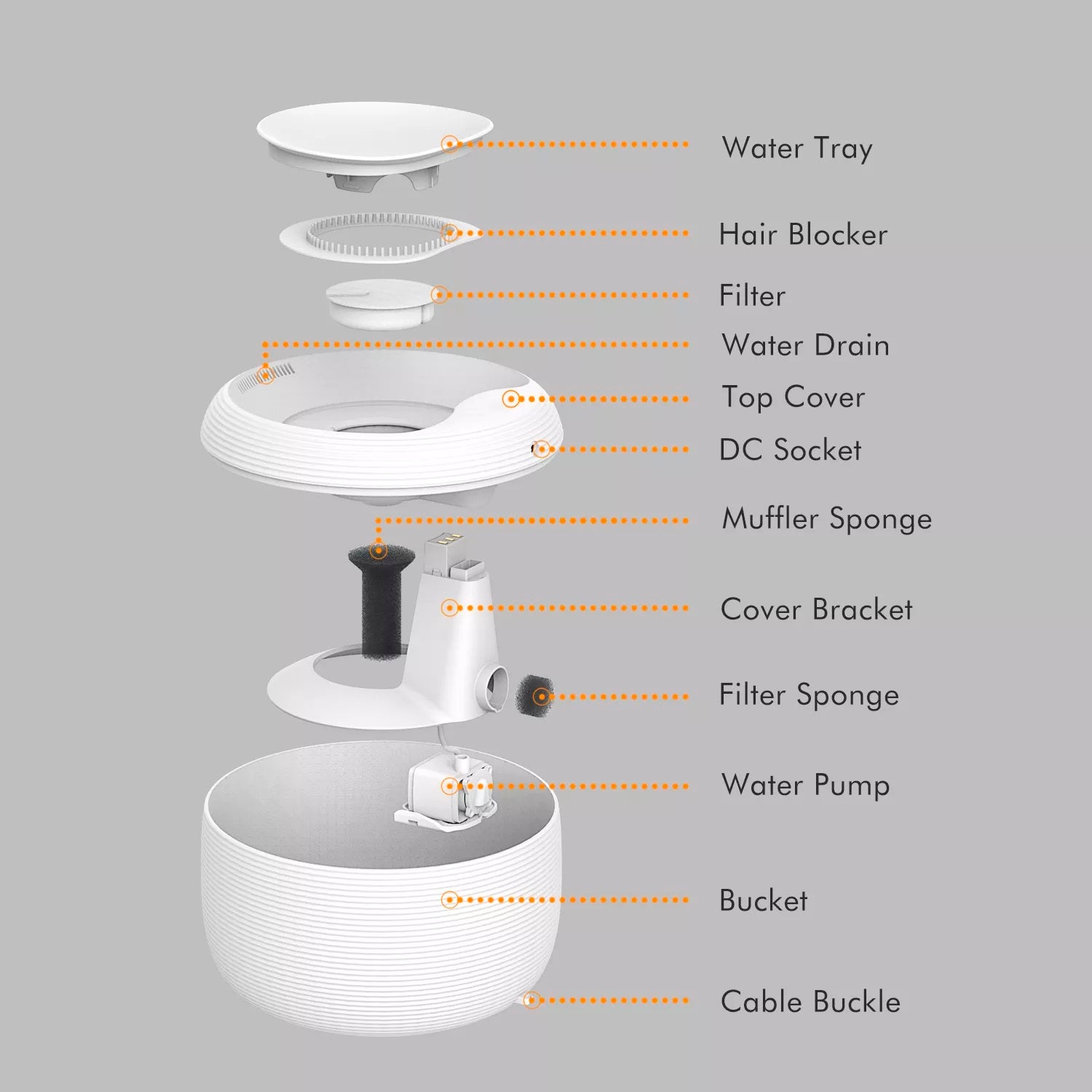 The Pet Pod Water Fountain provides your pets with fresh, filtered water while keeping convenience and hygiene in mind. Ideal for cats and small breed dogs, this fountain features a 3-layer coconut shell activated carbon filter to ensure clean, healthy drinking water. The built-in flush mode clears pet hair from the top drinking tray, while the whisper-quiet motor ensures peaceful operation. Its 2.5L capacity offers ample water storage, and the easy-refill top tray design means you can top up water without removing the lid. The Pet Pod is powered via an included USB adapter or a power bank for portable use, making it perfect for any home setup or during load shedding.